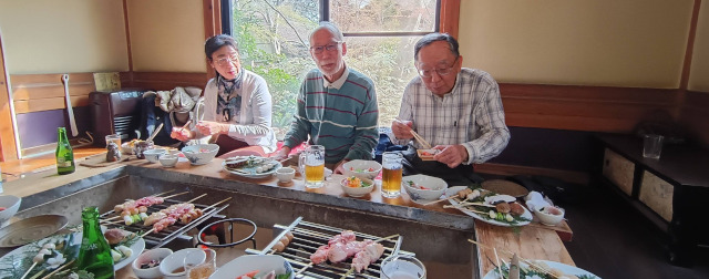 初回は、東大和公園を散策してから、貯水池鳥山という店で囲炉裏焼きを楽しんだ。貯水池というのは多摩湖のことを指しているのだが、店からも、店に行く途中の道からも、多摩湖を見ることはできなかった。参加者6人のうち、諸事情により歩くことができない2人は店の送迎バスを利用した。